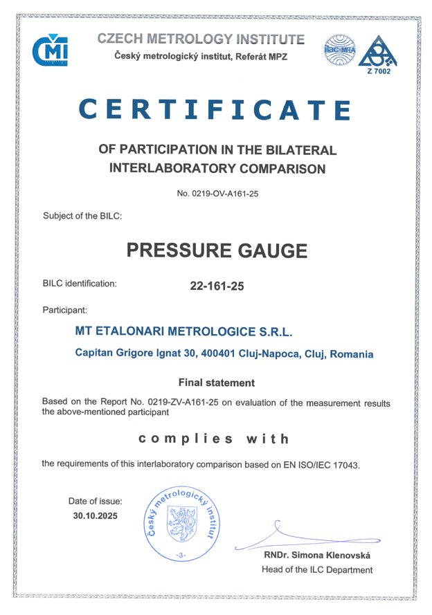 Laboratorul MT Etalonari Metrologice S.R.L. își consolidează permanent competențele prin participarea la comparații interlaboratoare internaționale, confirmând calitatea și trasabilitatea etalonărilor efectuate.